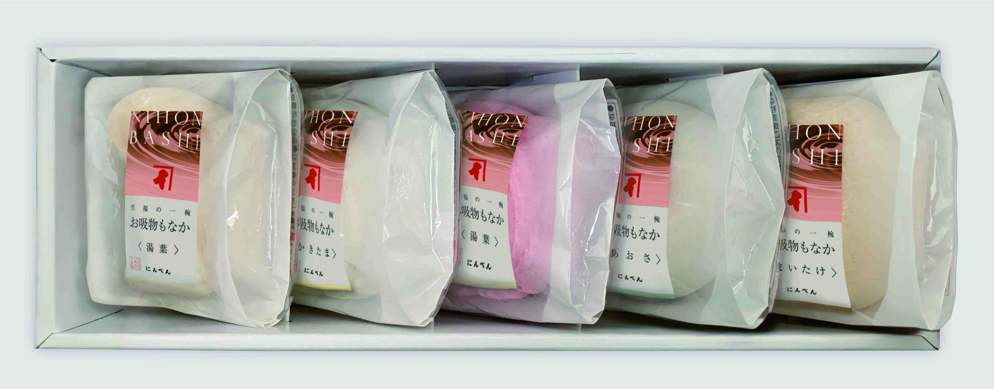 〈湯葉〉、〈かきたま〉、〈湯葉(ピンク)〉、〈あおさ〉、〈まいたけ〉が各1個入った詰合せです。