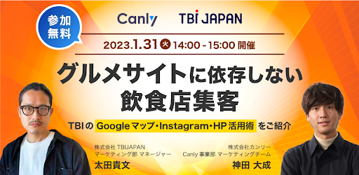 Googleビジネスプロフィール(旧・Googleマイビジネス)・HP・各SNSの一括管理サービス「Canly(カンリー)」の開発・提供を行う株式会社カンリー(所在地:東京都渋谷区、代表取締役:辰巳 衛,秋山 祐太朗)は、無料ウェビナー『グルメサイトに依存しない飲食店集客~TBIのGoogleマップ・Instagram・HP活用術をご紹介~』を1/31に開催します。