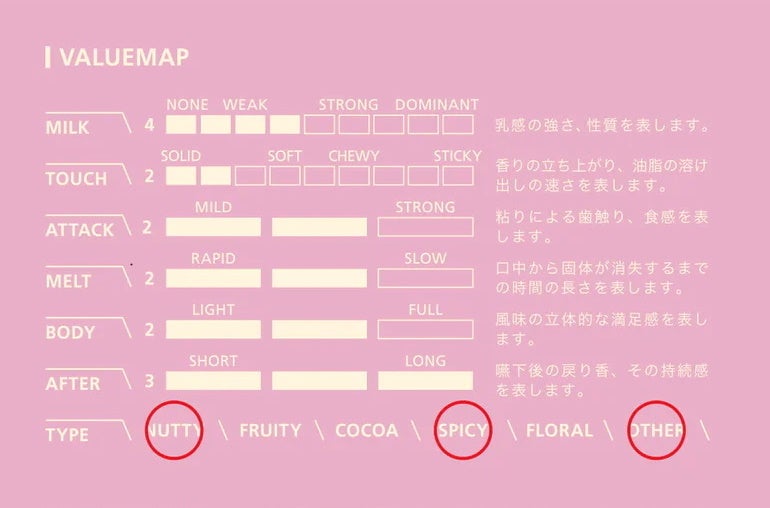 TYPE:ホワイトチョコレートの持つ、香りの分類を表します。