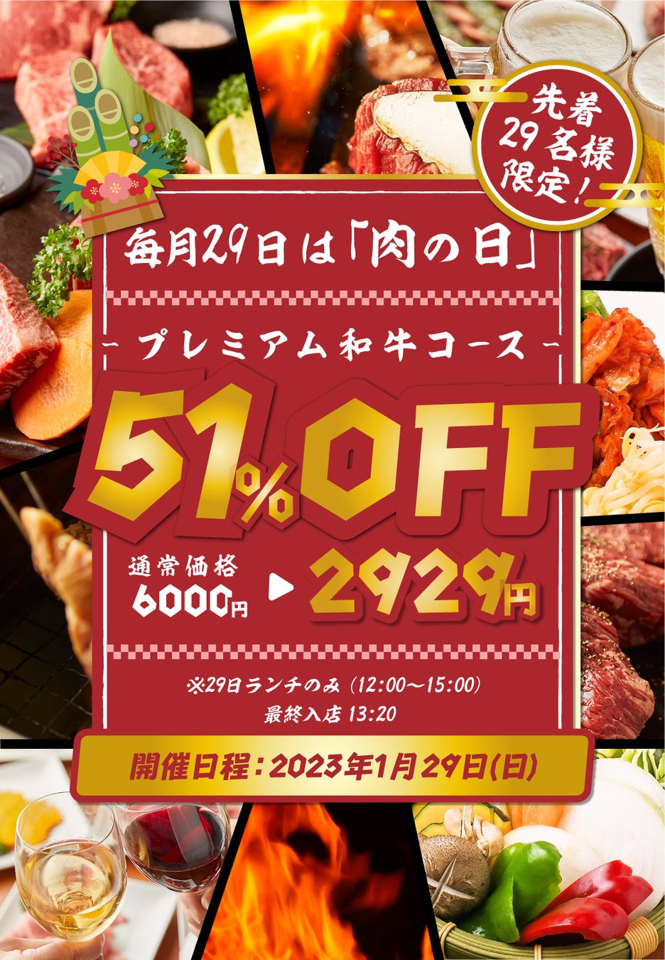 全100品以上⾷べ放題の「プレミアム和⽜コース」100min/6,000円(税込)を、⾁の⽇(2023年1⽉29⽇)限定で、