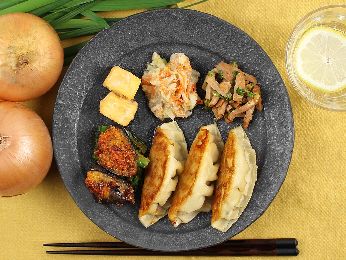 一般的な焼き餃子より糖質を35%カット*したもちっとした皮の焼き餃子です。餃子の具には豚、鶏のミンチ、キャベツ、玉葱、葱、ニラを使用しております。小松菜と、揚げ茄子の辣油あえを添えておりますので、辣油の辛味と一緒にお楽しみください。