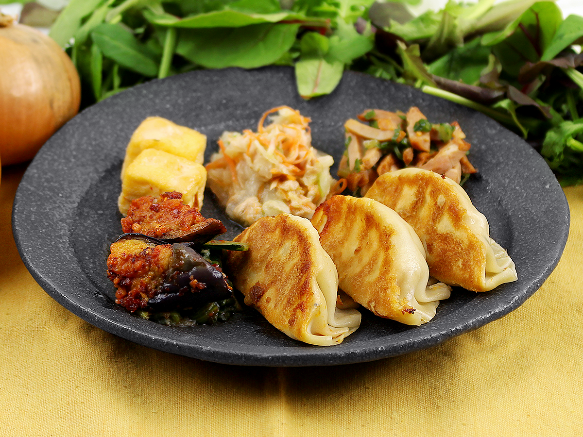 一般的な焼き餃子より糖質を35%カット*したもちっとした皮の焼き餃子です。餃子の具には豚、鶏のミンチ、キャベツ、玉葱、葱、ニラを使用しております。小松菜と、揚げ茄子の辣油あえを添えておりますので、辣油の辛味と一緒にお楽しみください。