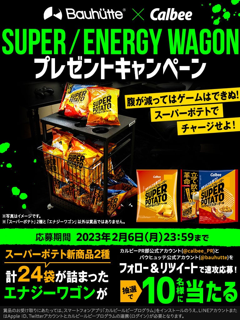 キャンペーンの賞品として、カルビーは「スーパーポテト」2種類、バウヒュッテからはゲームをする際、デスク周りに設置してスナックやドリンクを収納できるワゴン「エナジーワゴン」を組み合わせたセット、「スーパーエナジーワゴン」をプレゼントいたします。