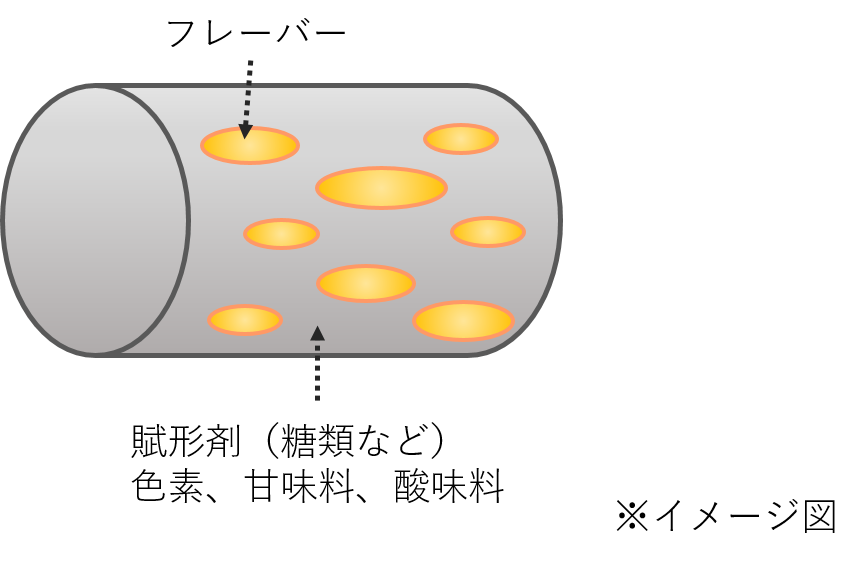 「フリス®」は、香料メーカーの高砂香料工業株式会社の登録商標です。粒が大きめで色を付けられるため、ガムやタブレットに用いられることが多い、カプセル化した香料です。口の中に入った後に、カプセルに閉じ込めた香りが押し寄せることが特長で、「ス―パーポテト」では、ポテトチップスに合うように独自開発したバター風味の「フリス®」を使用しています。