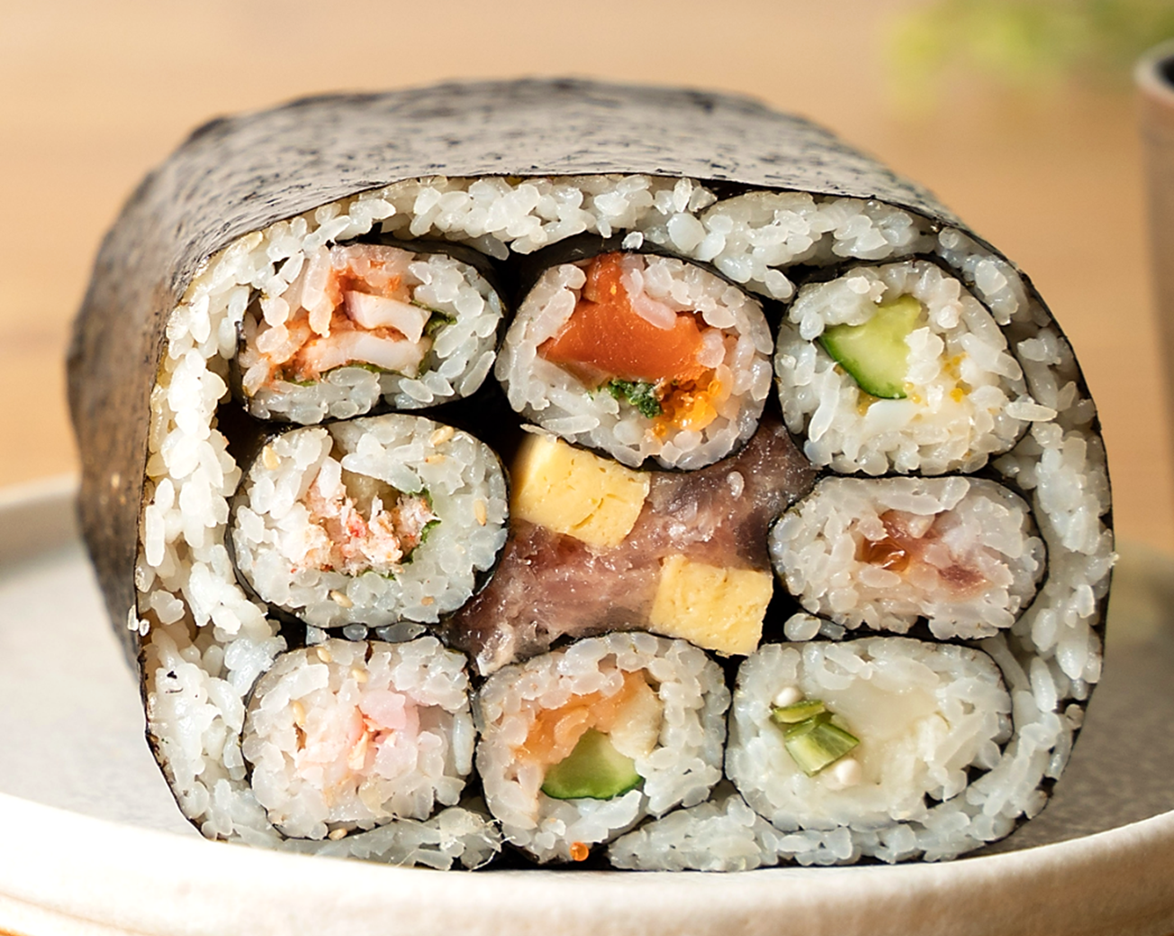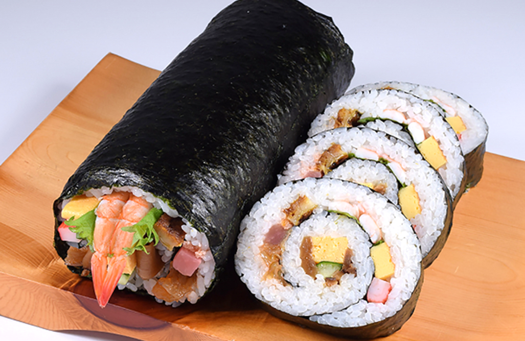 うず巻状に作ることで食べることに違った味が楽しめる恵方巻。どの部分からほおばるか考えながら食べるのも楽しみのひとつです。断面が鮮やかなので切ってみんなで食べるのにもおすすめです。