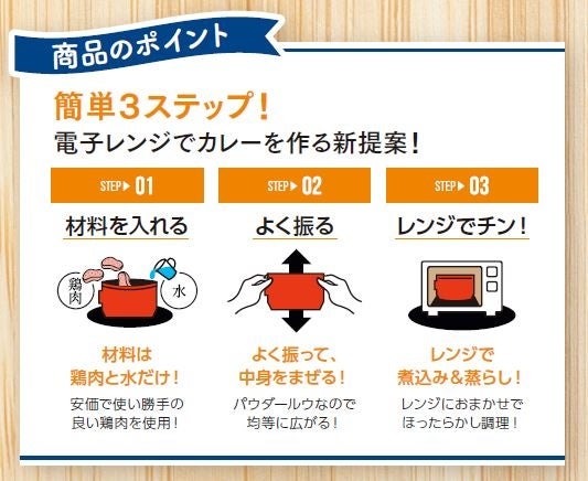 | レンジ調理を取り入れた「新規性のある手軽さ」により新しいカレーシーンを創造し、現状の即席カレーではカバーしきれない新規層の誘引を目指します。 |