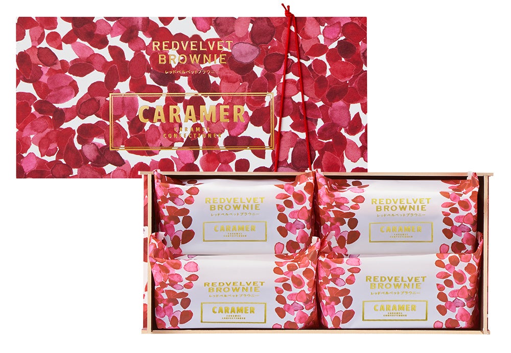 レッドベルベットブラウニーの深紅色を表現した花びらで彩った、華やかな限定パッケージはバレンタインの贈り物に華をそえます。
