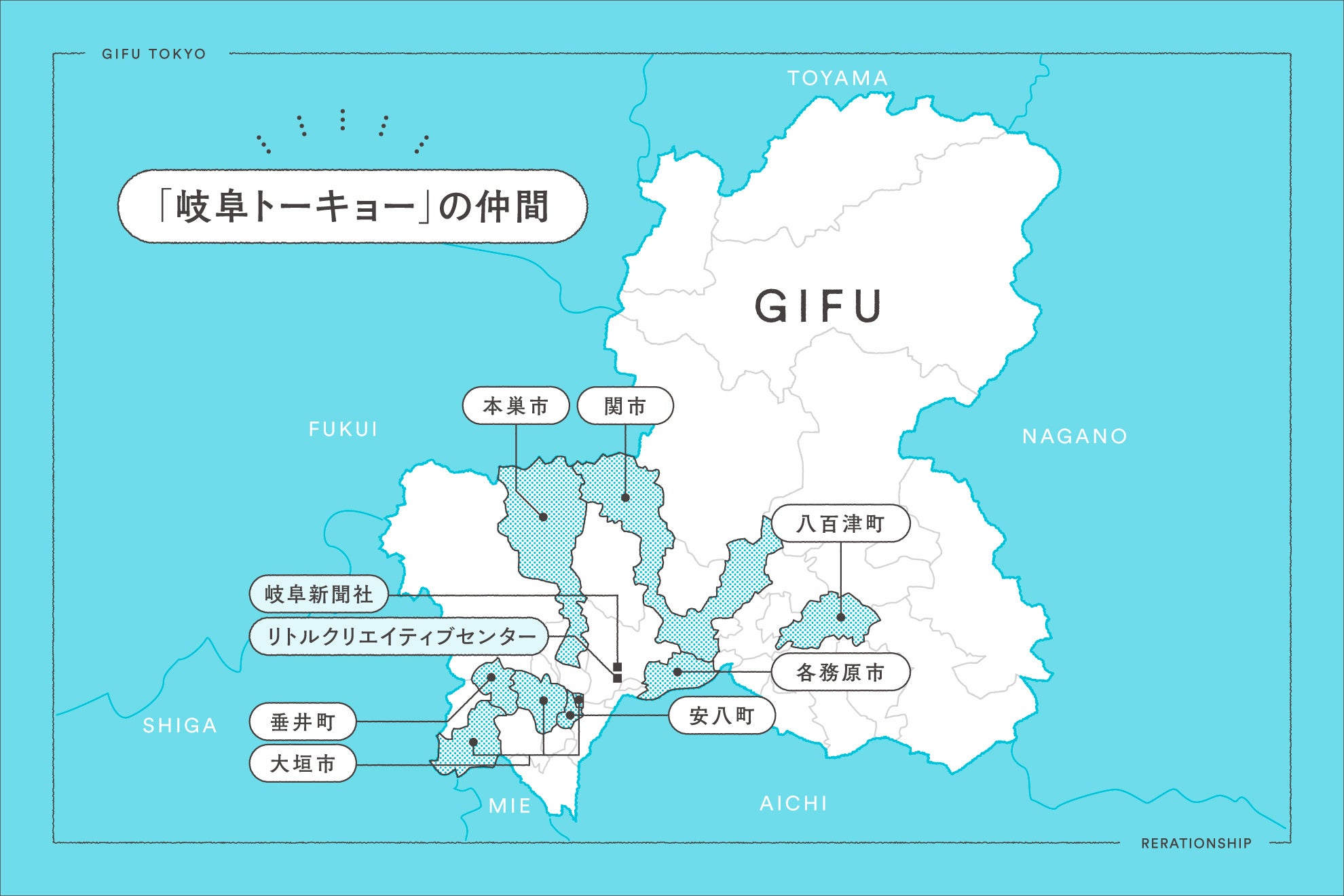 「岐阜トーキョー」は、岐阜県内の企業や自治体の方々と協力しながら“官民連携”で岐阜を全国へ発信する拠点です。株式会社リトルクリエイティブセンター、株式会社岐阜新聞社、各務原市、関市、本巣市、大垣市、垂井町、八百津町、安八町が協力し、一緒に運営を行います。