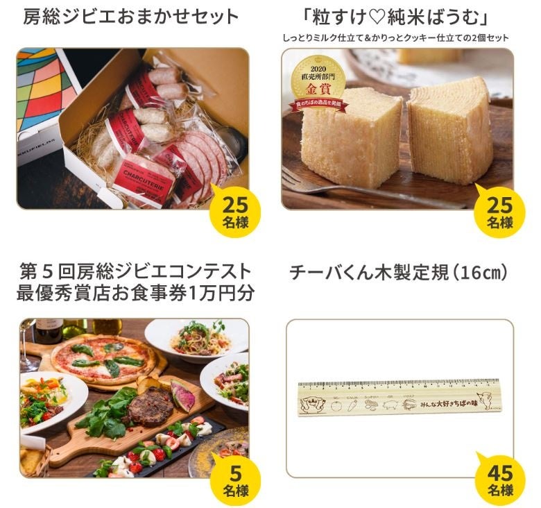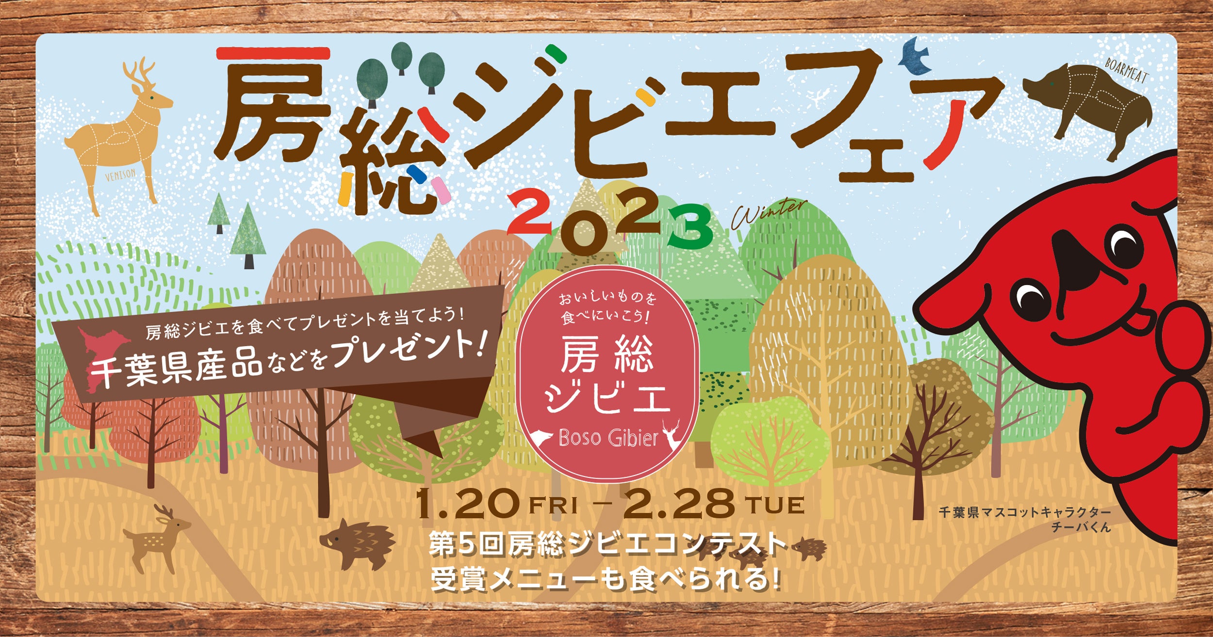 千葉県・東京都のフェア参加店で、期間中、房総ジビエメニューを提供するフェア。対象メニューをお食事、またはご購入いただくとプレゼントキャンペーンに応募ができます。応募された方の中から、抽選で100名に千葉県産品などをプレゼントします。