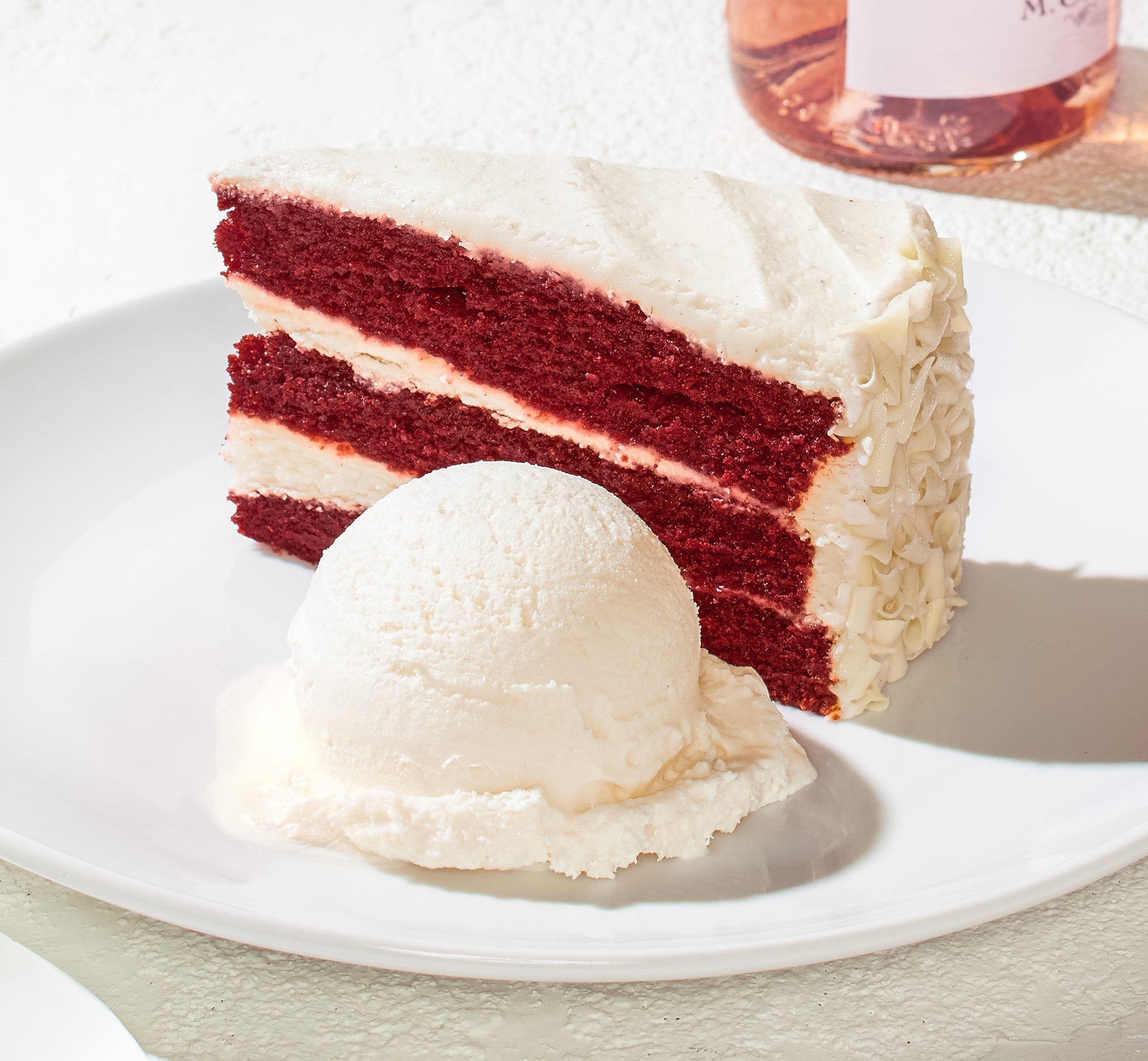 「レッドベルベットケーキ」は、真っ赤なココア風味のケーキをクリームチーズ風味の真っ白なフロストでコーティングしたスペシャルケーキ。添えたバニラビーンズホイップクリームとバニラアイスクリームと共に食べれば、夢心地の味わいです。甘さと酸味のバランスに加え、情熱的な赤、純粋な白のカラーは、熱い愛情を表現しているよう。大切な方と2人でシェアするのもおすすめです。
