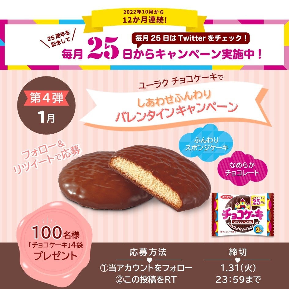 ユーラク「チョコケーキ」発売25周年を機に、より多くのみなさまにチョコケーキのおいしさを知っていただけるよう、2022年10月より12か月連続でチョコケーキが当たるキャンペーンを実施中です。「25周年」に掛けて毎月25日に開催する当キャンペーンの第4弾を、2023年1月25日(水)昼12時より開催いたします。
