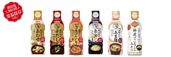 “鮮度みそ”シリーズは“お料理をもっとおいしく!もっと便利に!”、そんな声におこたえするため2017年に誕生した鮮度ボトル採用のだし入りの液状みそです。開封後も90日間常温でおいしさをキープできるので、いつでもどこでも、お湯を注ぐだけでできたてのおみそ汁をお楽しみいただけます。生でも液体でもない“液状みそ”だから、1滴ずつ量を調節できてサッと溶けるので、おみそ汁以外のお料理にも大変便利にお使いいただけます。