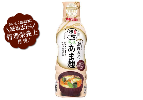 管理栄養士の 97%が推奨。当社商品「鮮度のこうじみそ」と比較して塩分を 25%カットし、おいしさ×健康×便利を叶える減塩タイプの液状みそです。国産原料の米みそ、国産米使用の甘酒を使用し、みそと甘酒の複雑な「甘み」「旨み」「コク」で減塩ながらも満足感があり、バランスの良い味わいに仕上げました。「米みそ」と「米麹甘酒」は米を原料とする発酵食品であり、味の相性は抜群。健康的なイメージがあるみそと、近年発酵食品として再注目される甘酒を合わせることで、より健康感をアップさせました。空気に触れにくい「鮮度ボトル」を採用しているため、開封後も90日間常温でおいしさをキープできます。