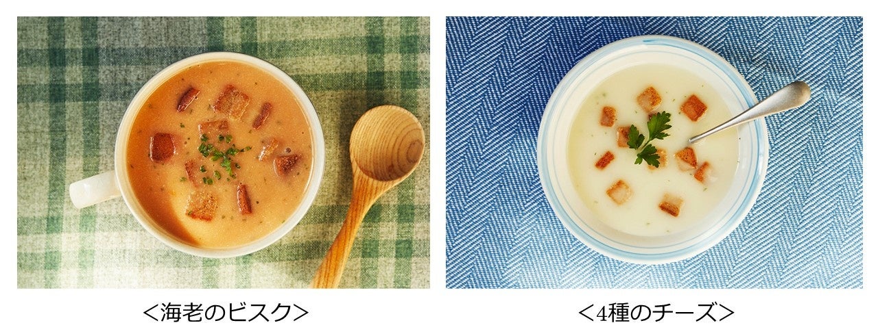 <海老のビスク>は海老のうま味が溶け込んだクリーミーでコク深い味わい、<4種のチーズ>はモッツァレラ、チェダー、ブルー、パルメザンの4種のチーズが溶け込んだ濃厚な味わいが特長です。