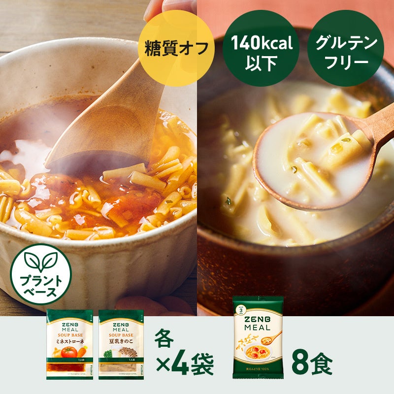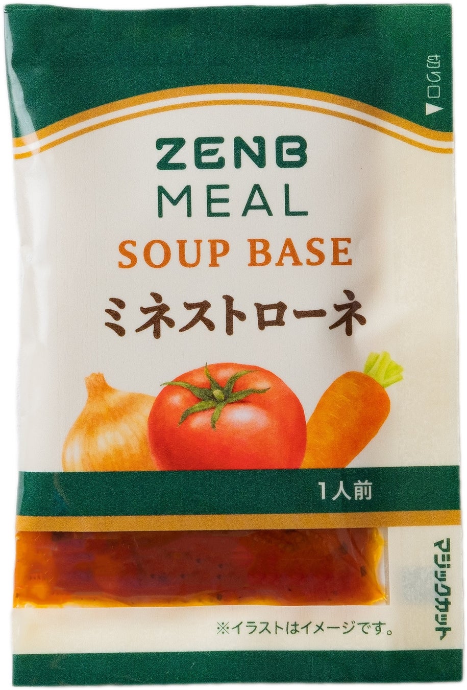 「ZENBミール」に 水を加えてレンジで3分加熱し、本品を加えるだけでスープミールがつくれる専用のスープベースです。動物性原料や添加物に頼らない味づくりで、「ZENBミール」の豆の旨みを活かし、プラントベース&グルテンフリーにこだわりました。カロリー140kcal以下で、糖質オフ※1だからカラダにもうれしい。時間のない朝でも、おいしく満足感のあるヘルシーな”食べるスープミール”が手軽に楽しめます。