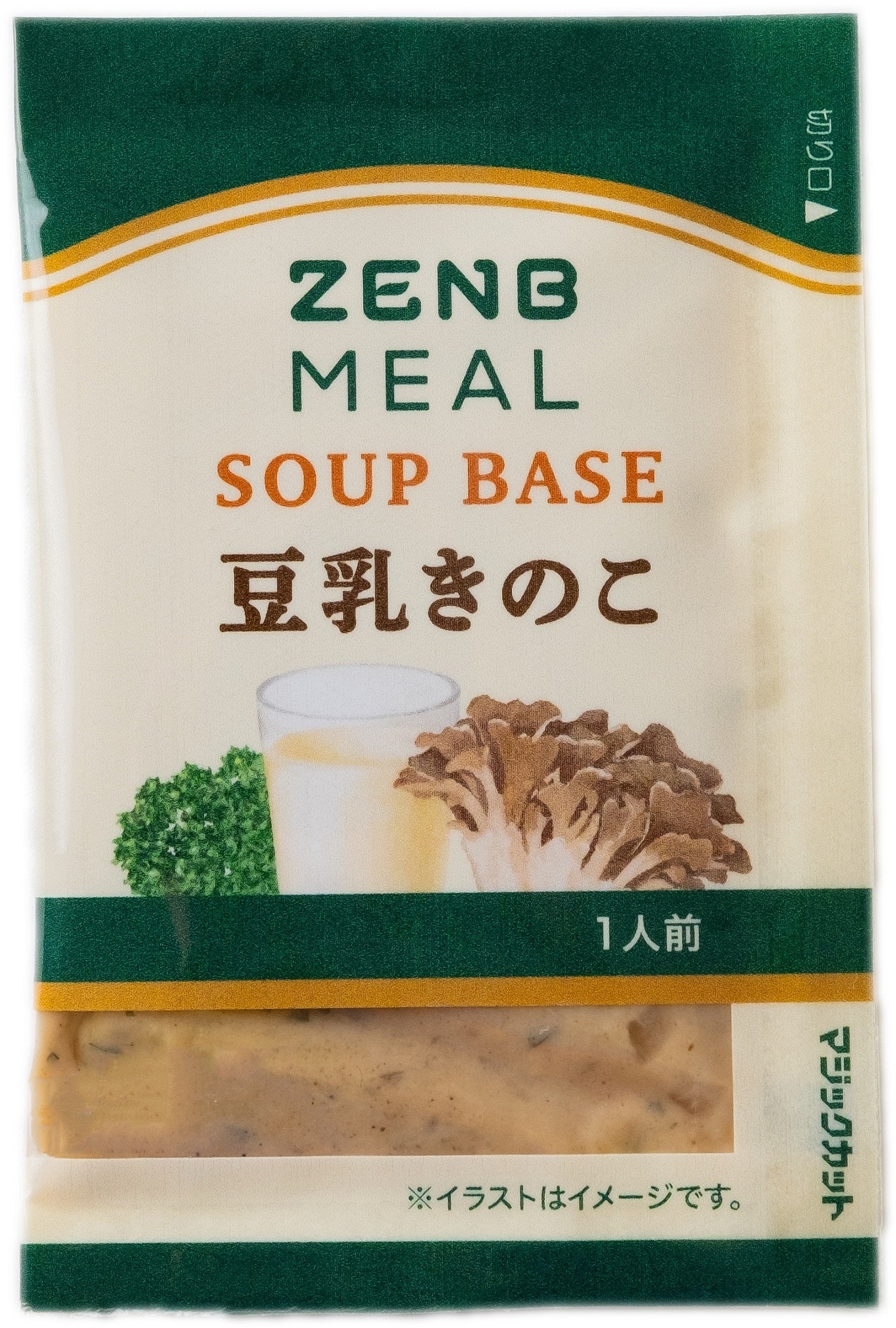 「ZENBミール」に 水を加えてレンジで3分加熱し、本品を加えるだけでスープミールがつくれる専用のスープベースです。動物性原料や添加物に頼らない味づくりで、「ZENBミール」の豆の旨みを活かし、プラントベース&グルテンフリーにこだわりました。カロリー140kcal以下で、糖質オフ※1だからカラダにもうれしい。時間のない朝でも、おいしく満足感のあるヘルシーな”食べるスープミール”が手軽に楽しめます。