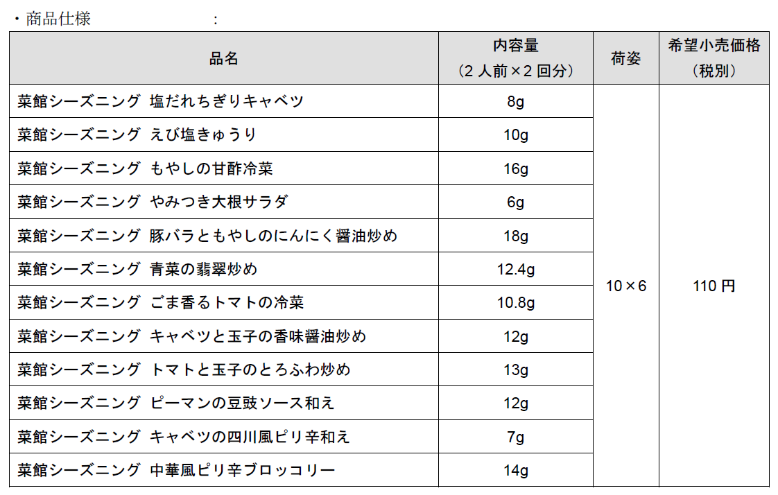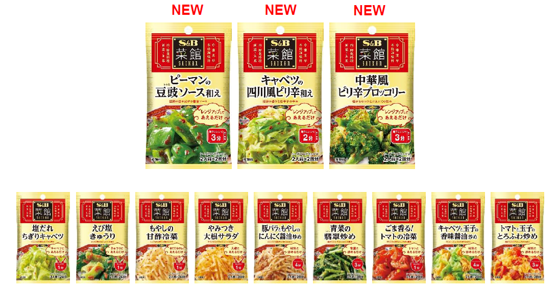 エスビー食品株式会社は、身近な素材で手軽に中華メニューが楽しめる「菜館シーズニング」シリーズの既存9品をリフレッシュし、新たに「ピーマンの豆豉ソース和え」「キャベツの四川風ピリ辛和え」「中華風ピリ辛ブロッコリー」を追加発売します。