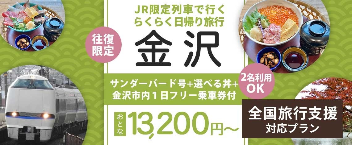 関西発《日帰り》JR限定列車で行く!日帰りプラン金沢★選べる丼+金沢市内1日フリー乗車券付き【2名様からご利用OK】石川県の全国旅行支援「いしかわ旅行割」を利用。
