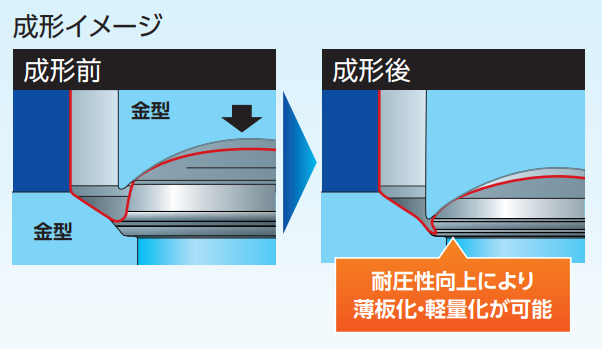 CBRは、従来の製缶技術と比べ、高い缶底耐圧強度を提供することができるなど、品質と軽量化が両立できる革新的技術であり、アルミ材料の使用量削減にともなう温室効果ガスの排出量減少にも繋がります。