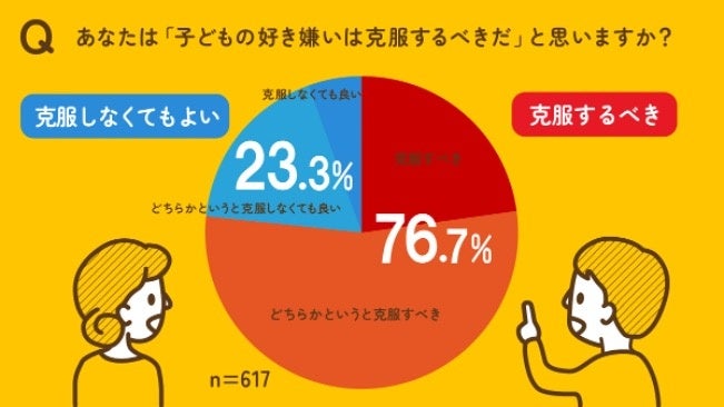 小学生までの子どもをもつ親合計617名を対象に「子どもの好き嫌いについて」調査しました。『子どもの好き嫌いは克服すべきか?』という質問に対し、「克服すべき」が76.7%、「克服しなくても良い」が23.3%と、克服すべき派が7割以上という結果に。