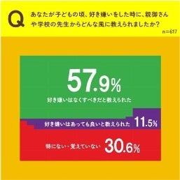 続いて親の子ども時代の好き嫌いに関する経験を聞くと、53.5%が「子どもの頃好き嫌いが原因で当時親に叱られた経験がある」、57.9%が「子どもの頃、好き嫌いをした時に、親御さんや学校の先生から好き嫌いはなくすべきだと教えられた」と回答。