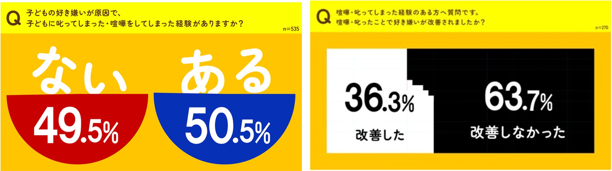 TOPIC②:好き嫌いがある子どもと親の経験や抱える悩みを調査 子どもの好き嫌いで・・・半数の親が「叱った・喧嘩をした」、しかし「改善しなかった」が6割以上
