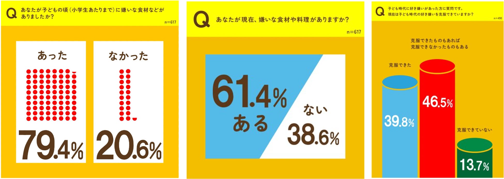 さらに、子どもに対する「好き嫌いエピソード」を調査でヒアリング。「給食のメニューがどうしても食べられないのでその日は休んだ」「子ども3人嫌いなものがそれぞれ違うので献立作りにいつも悩む!」など様々な親の家庭の実体験に基づいたエピソードがありました。