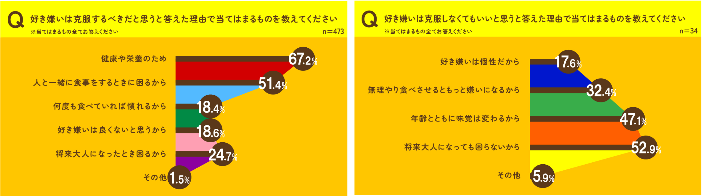 克服すべきと回答した理由として「健康や栄養のため」(67.2%)、克服しなくても良いと回答した理由は「将来大人になっても困らないから」(52.9%)という意見が最も多い結果となりました。