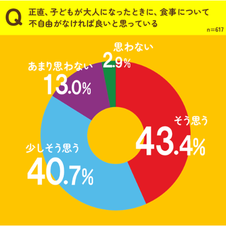 改めて子どもの好き嫌いについて様々な切り口から調査を実施しました。55.6%が「自身の体験から、“嫌いな食べ物は克服しなければいけない”という固定概念がある気がする」という結果に。周りに「子どもの好き嫌いを克服しなくてもOK」が多ければ賛同したいと思う親は63.9%、親の84.1%が「子どもが大人になったときに、食事について不自由がなければ良い」と回答しました。
