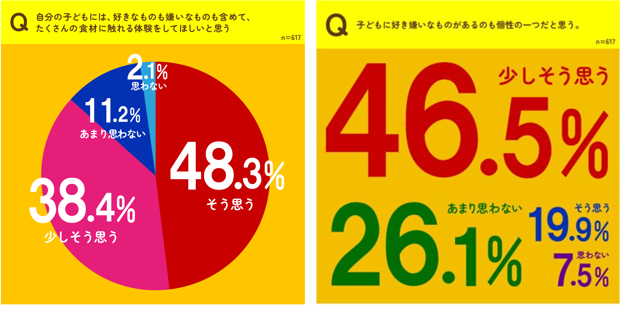 一方で、47.9% の親が「好き嫌いがあることは生活する上で影響があると思わない」と回答し、幼少期の経験があっても好き嫌いに対して生活する上で影響があると思わないことがわかりました。