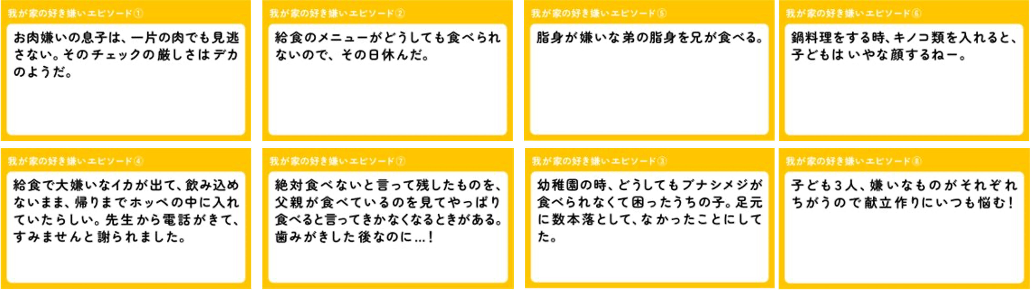 さらに、子どもに対する「好き嫌いエピソード」を調査でヒアリング。「給食のメニューがどうしても食べられないのでその日は休んだ」「子ども3人嫌いなものがそれぞれ違うので献立作りにいつも悩む!」など様々な親の家庭の実体験に基づいたエピソードがありました。