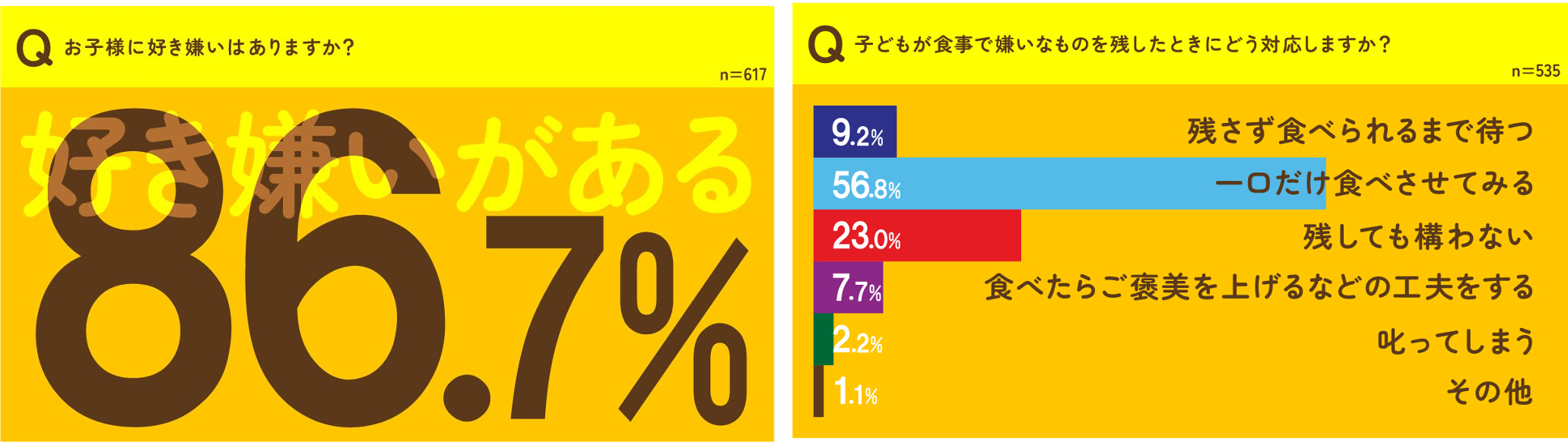 ●自分の子どもに好き嫌いがある親は86.7%。82.9%の親は「好き嫌いせず食べるように教えている」。子どもが食事で嫌いなものを残した時の対応一位は、「一口だけ食べさせてみる」56.8%