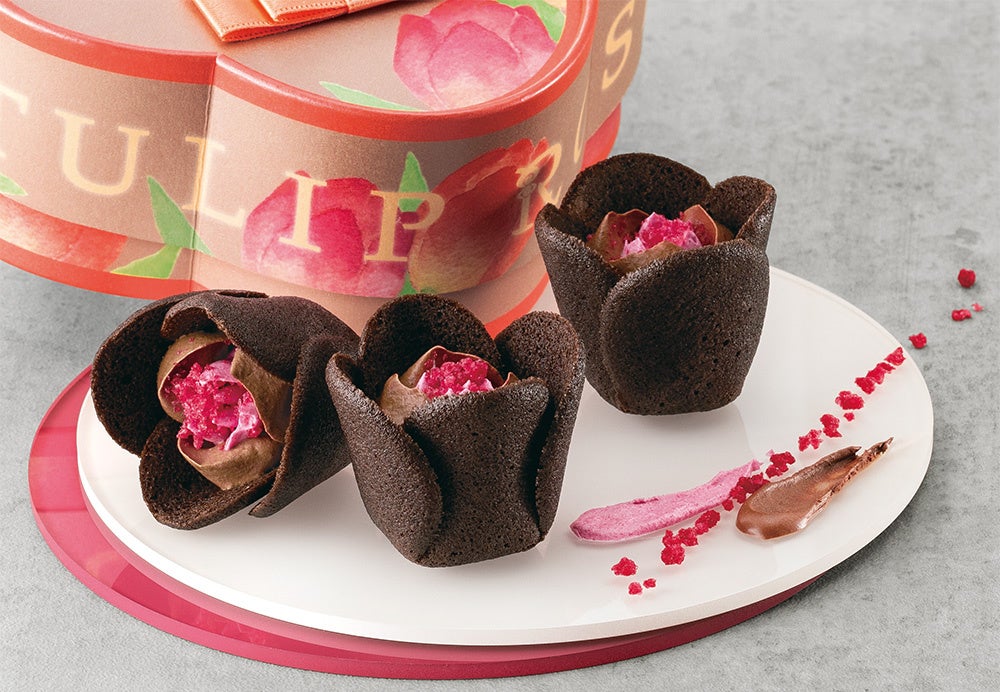 中でも代表作『チューリップローズ』は、可愛いチューリップと華やかなローズがひとつになった、とびきりよくばりなスイーツです。チューリップの花びらは、シャリシャリッと繊細なラングドシャクッキー。香り高いローズの花は、とろけるショコラクリーム仕立て!
