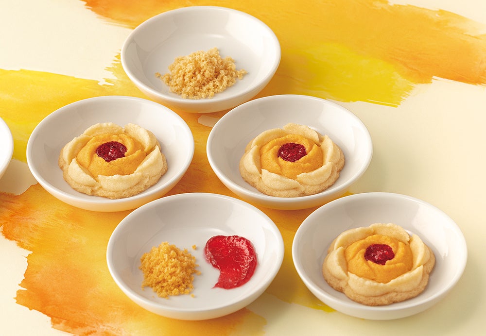オレンジ色の花びらは、ジューシーなバレンシアオレンジ果汁香るクッキー。クリームイエローの花びらは、芳醇国産バター香るバタークッキー。トップには甘酸っぱいラズベリー・コンフィチュールの朝露をのせて、さっくりと焼き上げました。