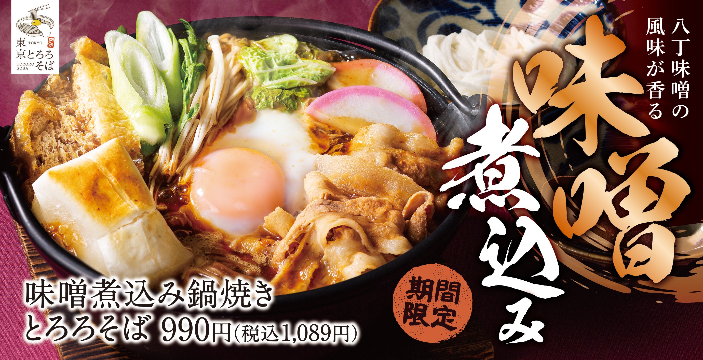 発売当初から今までにない組み合わせとビジュアルも相まって4割以上のお客さまに選ばれている「鍋焼きとろろそば」シリーズに、新メニュー「味噌煮込み鍋焼きとろろそば」が期間限定で登場いたします。