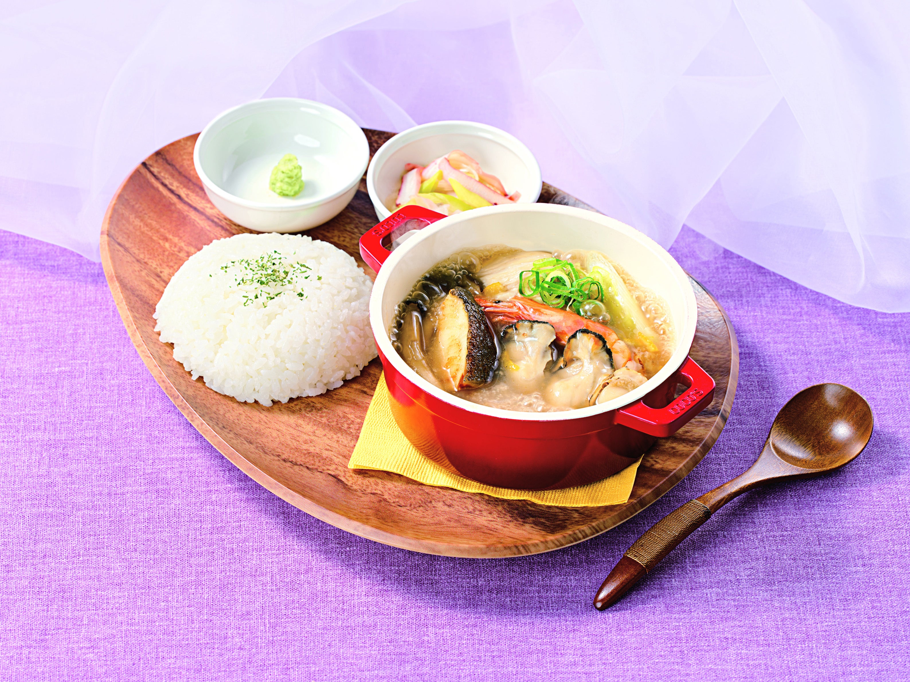 とろ~りやわらかな生湯葉と4種の海鮮、京風お出汁を組み合わせた海鮮鍋に、季節の小鉢とご飯をセットにした贅沢なプレートです。広島県産牡蠣、鱈(たら)、帆立、有頭エビの4種の海鮮は、ココットに入れオーブンで調理することで、ふっくらとした食感とジューシーな味わいを引き出しました。刻み柚子が爽やかに香る京風のお出汁は、生湯葉や海鮮と相性抜群です。海鮮の旨みと、生湯葉とお出汁のやさしい味わいを一緒にご堪能いただけます。お好みでわさびを加え、味の変化をお楽しみください。