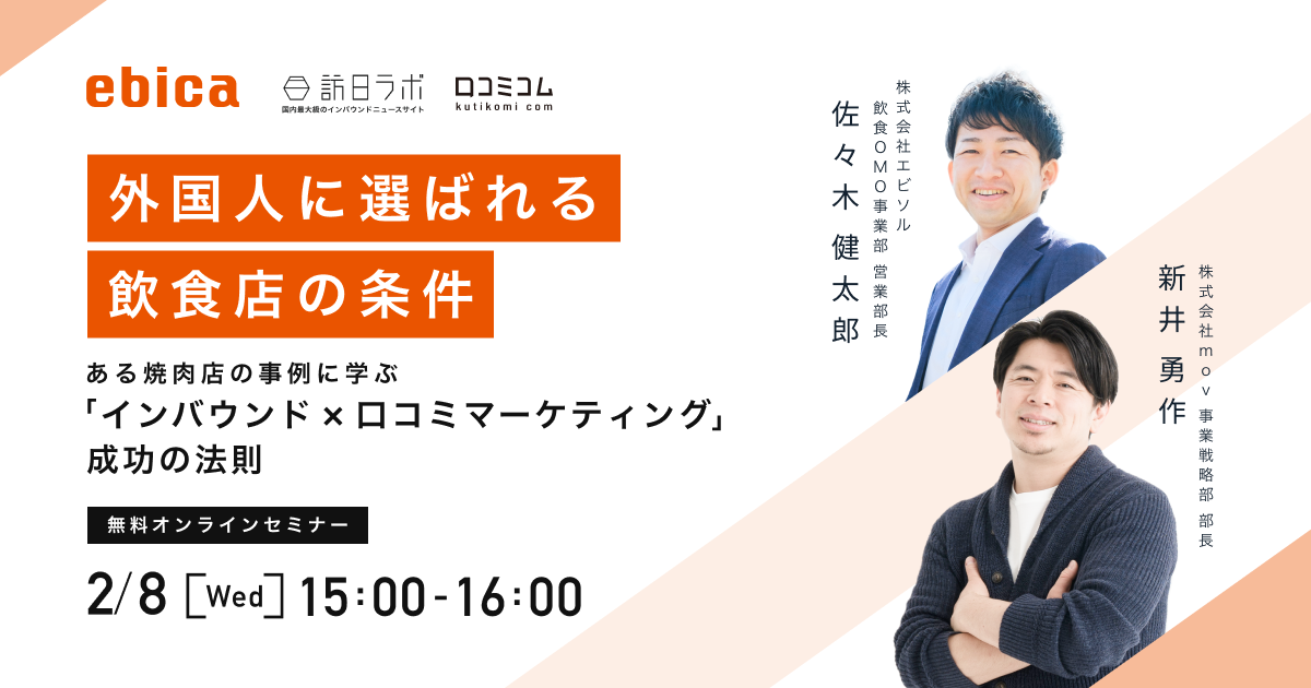 口コミサイトを”もっと”売上に変える、AI店舗支援SaaS「口コミコム」を運営する株式会社mov(代表取締役:渡邊 誠、本社:東京都渋谷区、以下mov)は、飲食店向け予約管理システム「ebica」を運営する株式会社エビソル(本社:東京都渋谷区、代表取締役:田中 宏彰、以下エビソル)と共催で、主に飲食店の集客・マーケティングご担当者様を対象としたセミナー「外国人に選ばれる飲食店の条件とは。ある焼肉店の事例に学ぶ インバウンド × 口コミマーケティング 成功の法則」を開催いたします。日程は2月8日(水)15:00 〜 16:00、参加費は無料です。