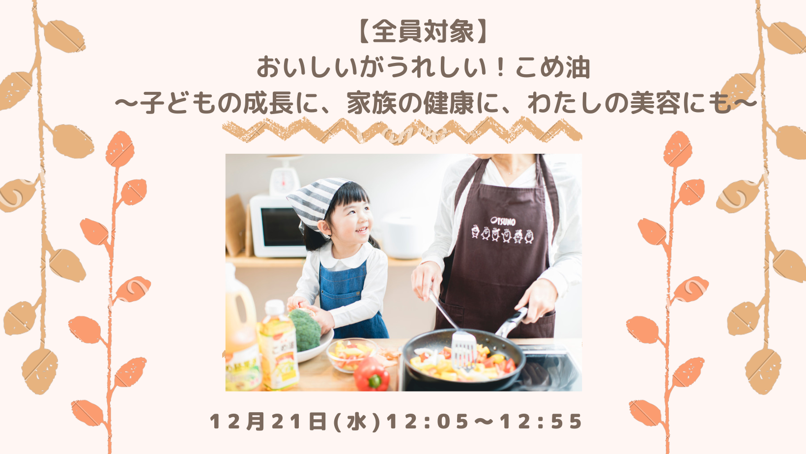 「なんとなく育休」をなくすことを目標とされた、産休・育休中の方限定のオンラインコミュニティにて「おいしいがうれしい!こめ油セミナー ~子どもの成長に、家族の健康に、わたしの美容に~」のテーマでこめ油や米ぬか由来商品について紹介いたしました。当セミナーはMIRAIS 4-5期出身である、主催のみーさん様がこめ油に出会い、その魅力を多くの方に紹介したいと考えてくださったことがきっかけとなり、今回開催に至りました。