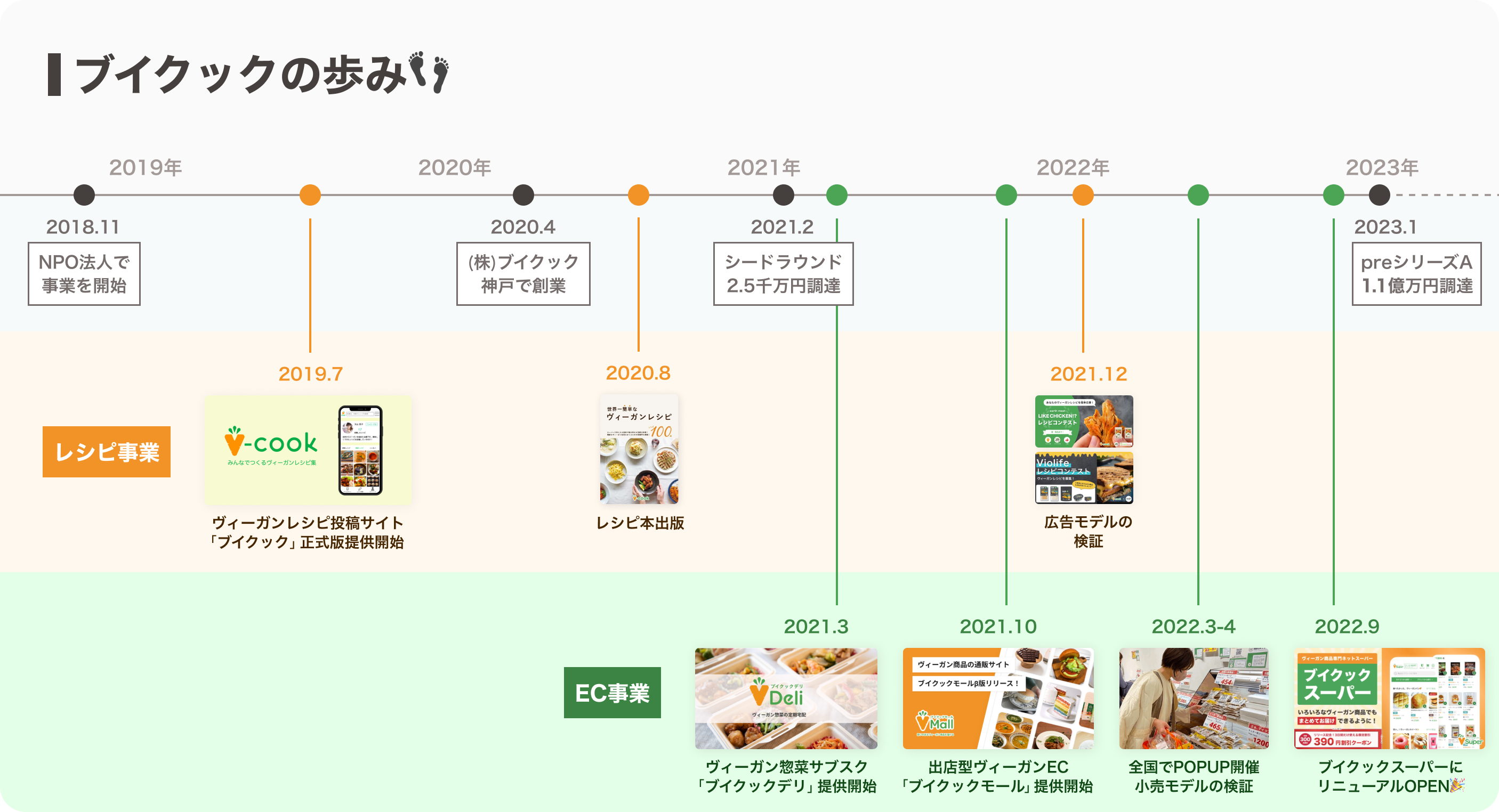 2019年(創業前)にヴィーガンレシピ投稿サイト「ブイクック」を提供開始し、創業後「レシピ本」の出版、冷凍惣菜サブスク「ブイクックデリ」、オンラインモール「ブイクックモール」の開発・提供を行い、実験を繰り返してきました。