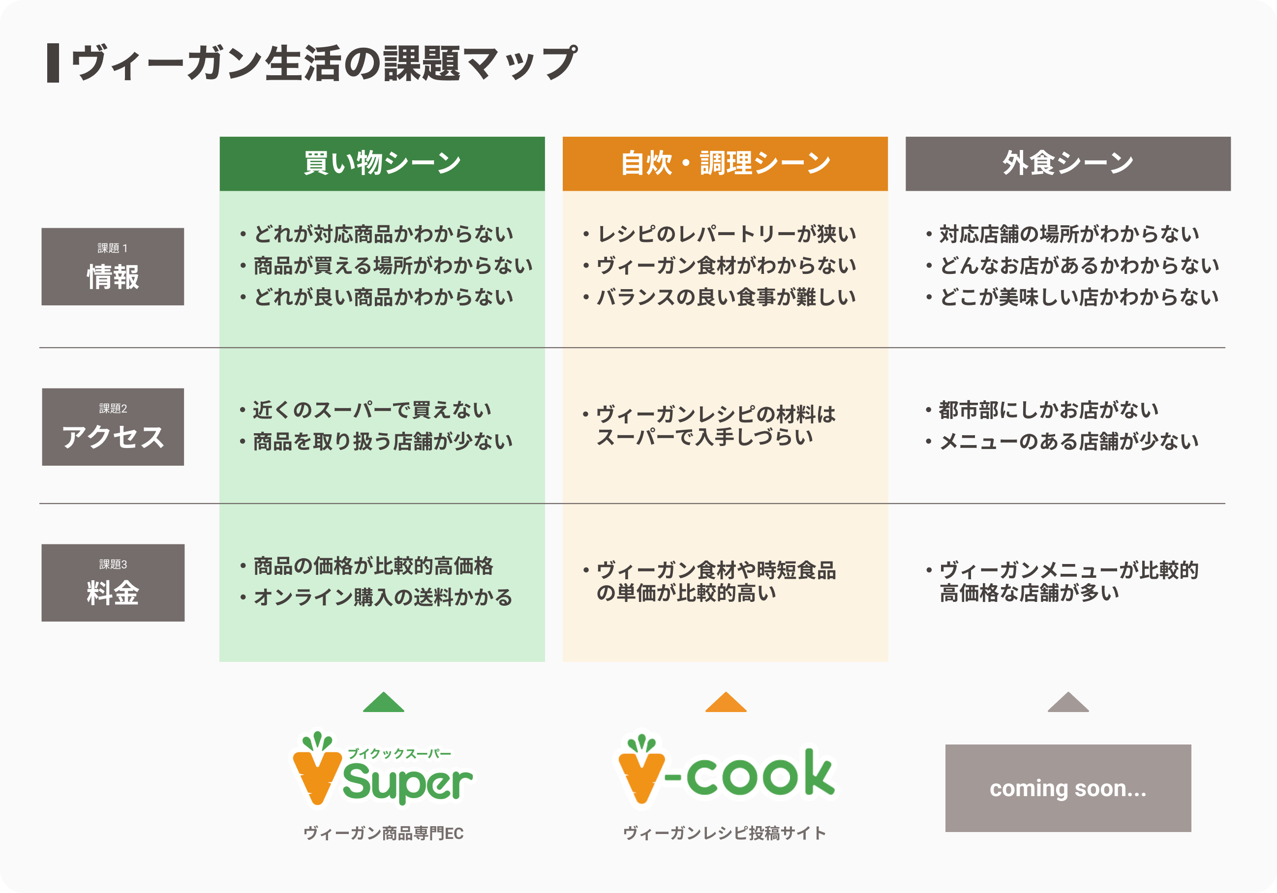 しかし、日本におけるヴィーガン生活の課題は山積みです。ブイクックスーパーで取り組んでいる「買い物」シーンだけではなく、「調理」「外食」「旅行」「人間関係」など、本当に様々なシーンで困難があります。