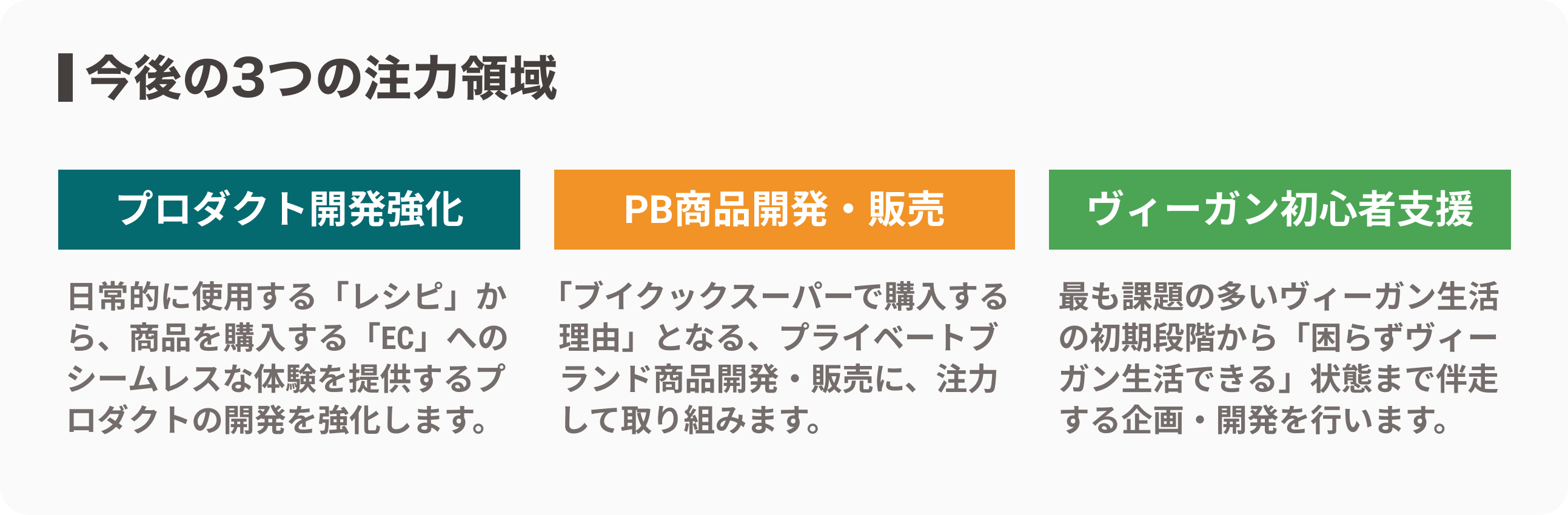 今回調達した資金は、商品開発、UXデザイナー、ソフトウェアエンジニアなどの職種の採用に投資を行い、まずはヴィーガン商品専門EC「ブイクックスーパー」のPMFに向け、プロダクト開発強化・PB商品開発/販売・ヴィーガン初心者支援の3点に注力します。