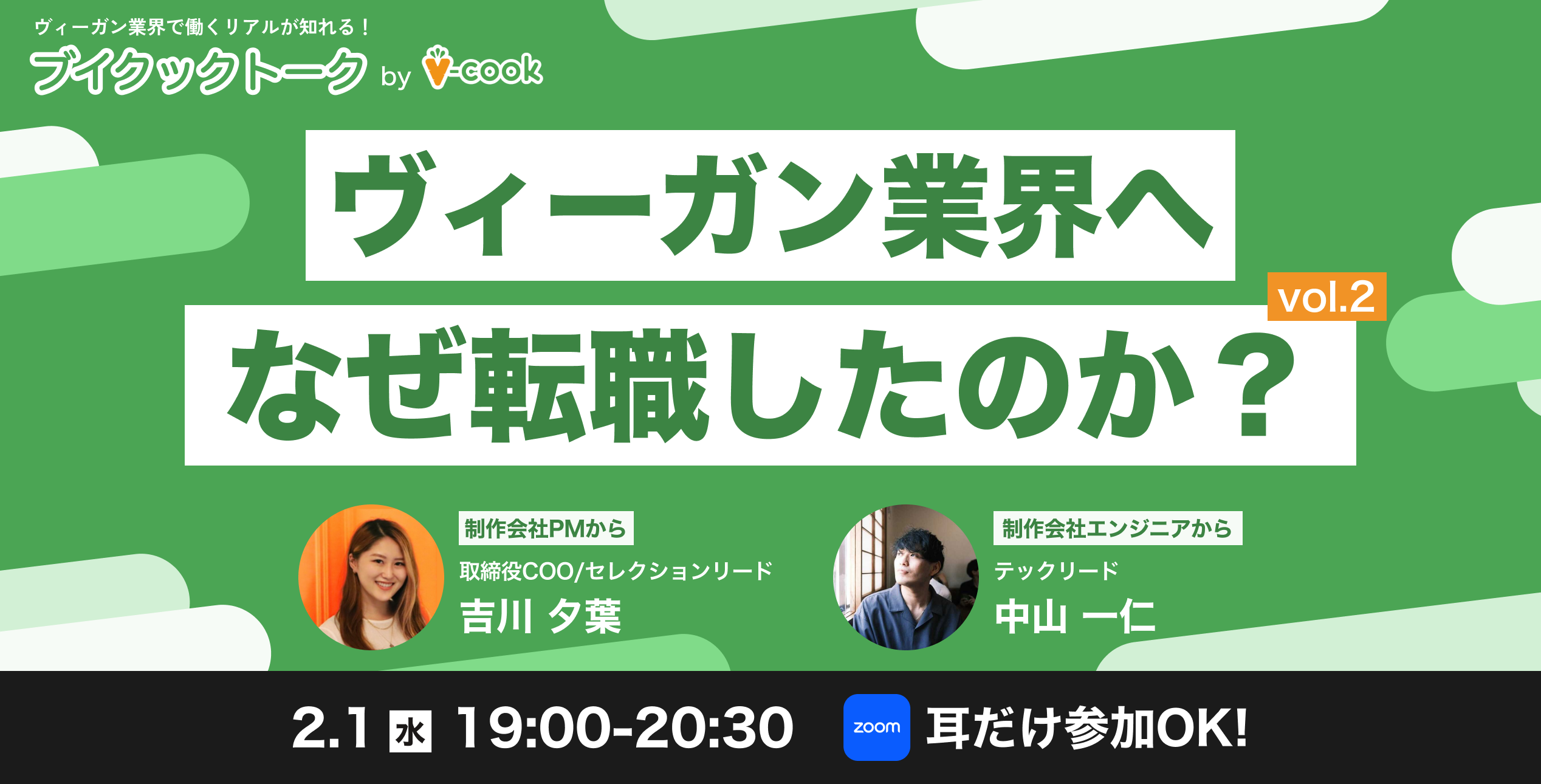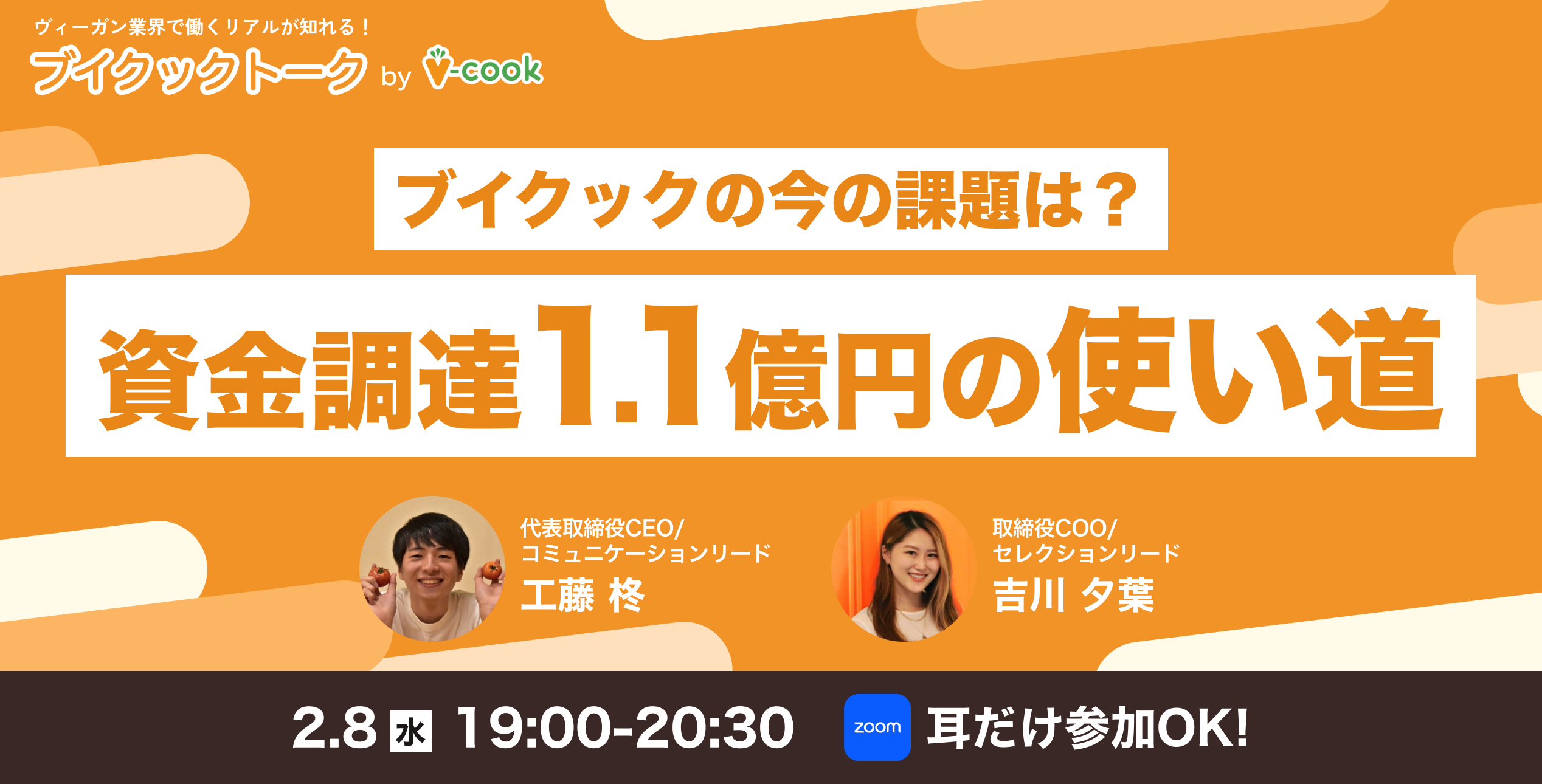 「資金調達1.1億円の使い道」「ヴィーガン業界に転職した理由」「プロダクト開発の裏側」などをテーマに、ここでしか聞けないヴィーガン業界で働くリアルが聞けるオンラインイベント『ブイクックトーク』を3連続開催いたします。