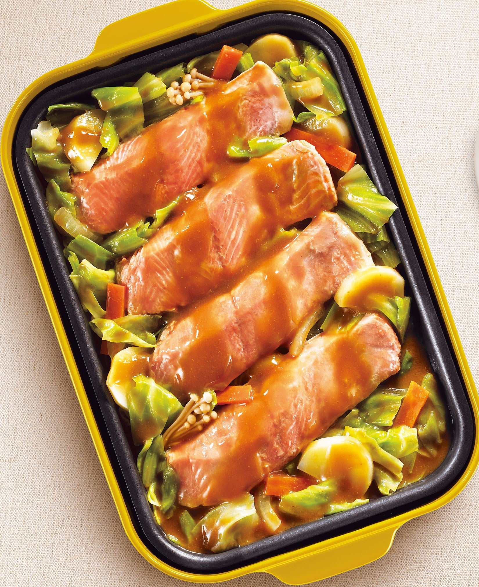 ホットプレートに材料を並べ、たれを加え蒸し焼きにしてできあがり。