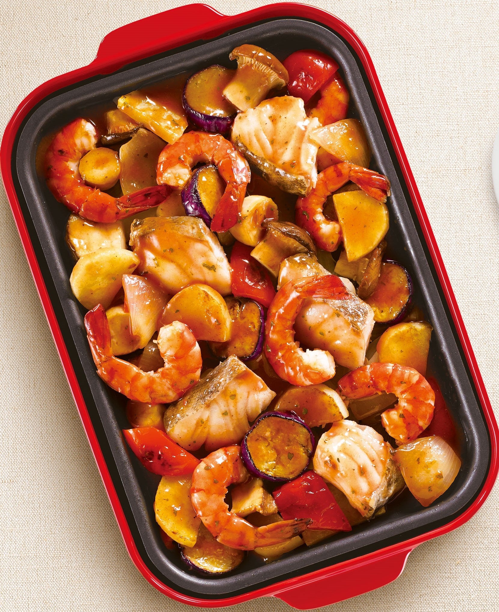 野菜に焼き色をつけ、魚介を入れてたれを加えたらフタをして蒸し焼きにします。軽く混ぜ合わせてできあがり。