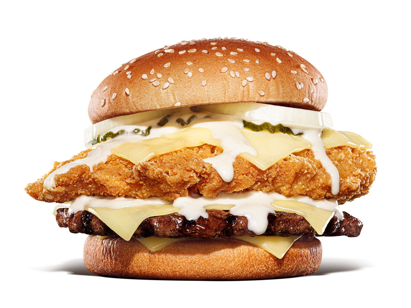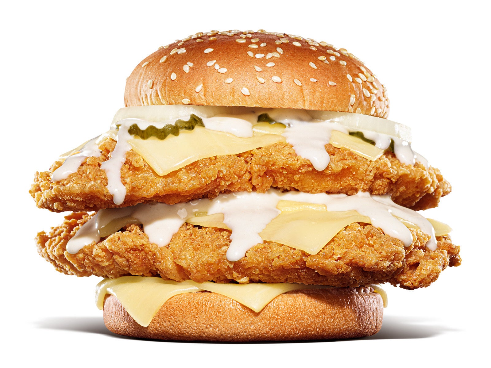 『ダブルチキン・ゲレンデ』は、巨大鶏むね一枚肉を使用したジューシーでサクサクなチキンパティを2枚使用した、味もサイズも別格のチーズバーガーです。ゴーダチーズスライス6枚にたっぷりのホワイトチーズソースを使用しました。バーガーキング® の巨大チキンパティとチーズのおいしさを思い切りお楽しみいただけます。