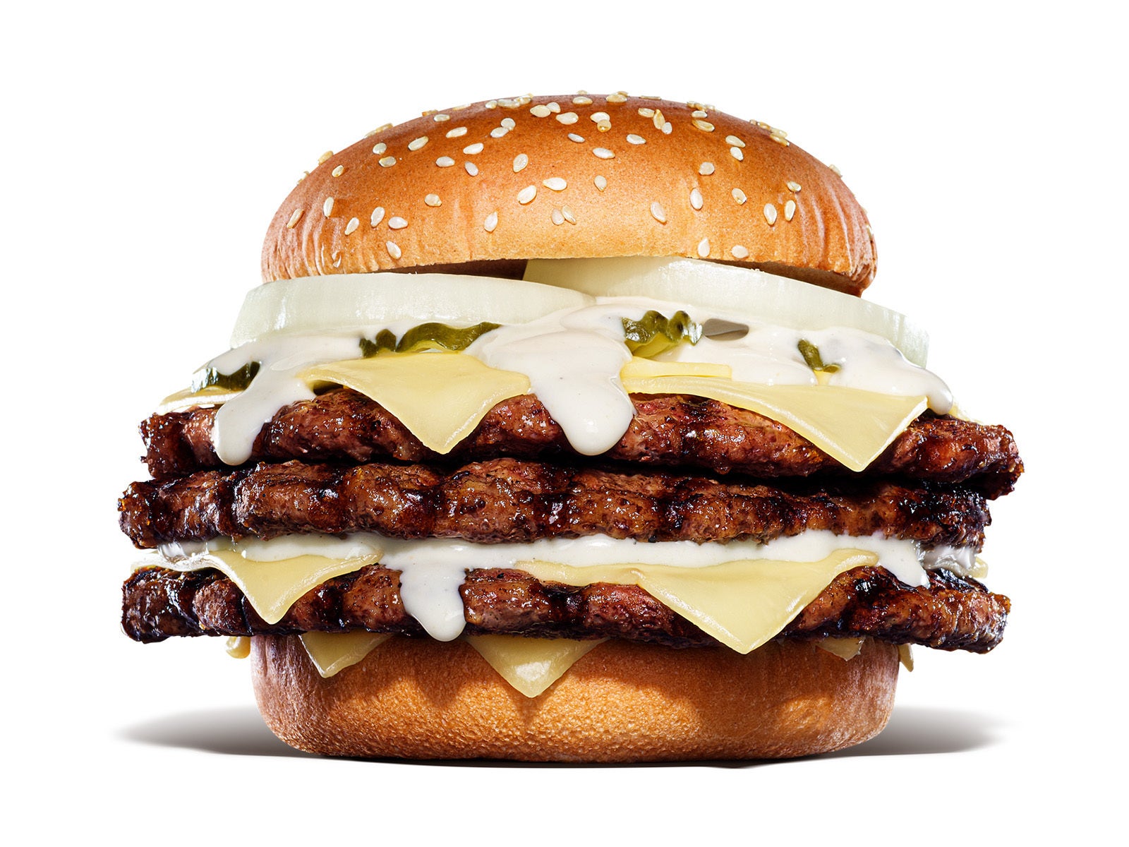 『トリプルビーフ・ゲレンデ』は、バーガーキング® 自慢の直火焼きの100%ビーフパティ3枚に、シャキシャキのオニオンと味のアクセントのピクルス、まろやかな味わいのゴーダチーズスライスを贅沢に6枚重ねました。