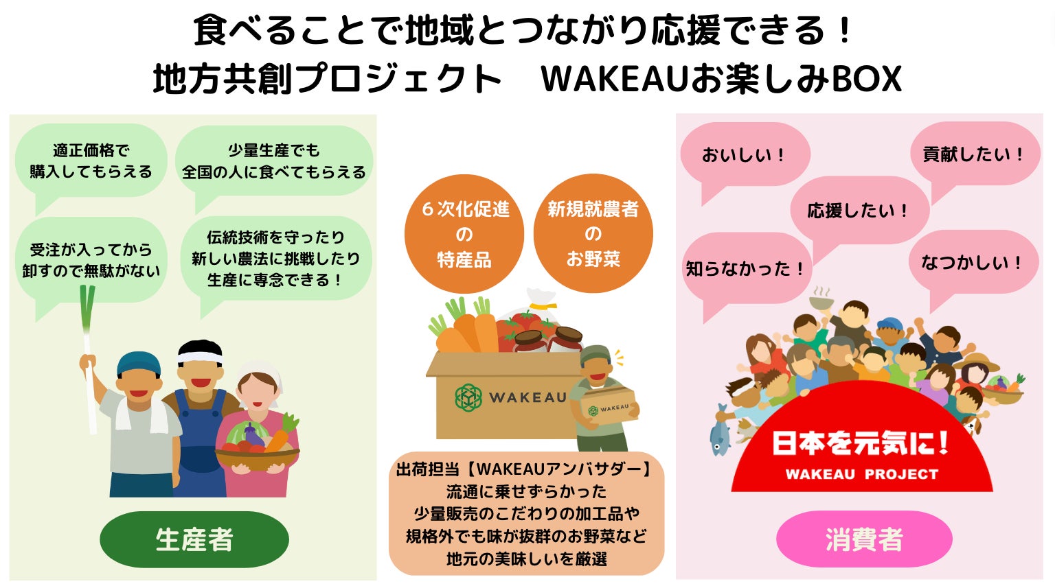 WAKEAUお楽しみBOXとは、月1回地域の野菜や加工品を詰めこんだBOXをお届けする6回1巡のサブスクリプションサービスです。