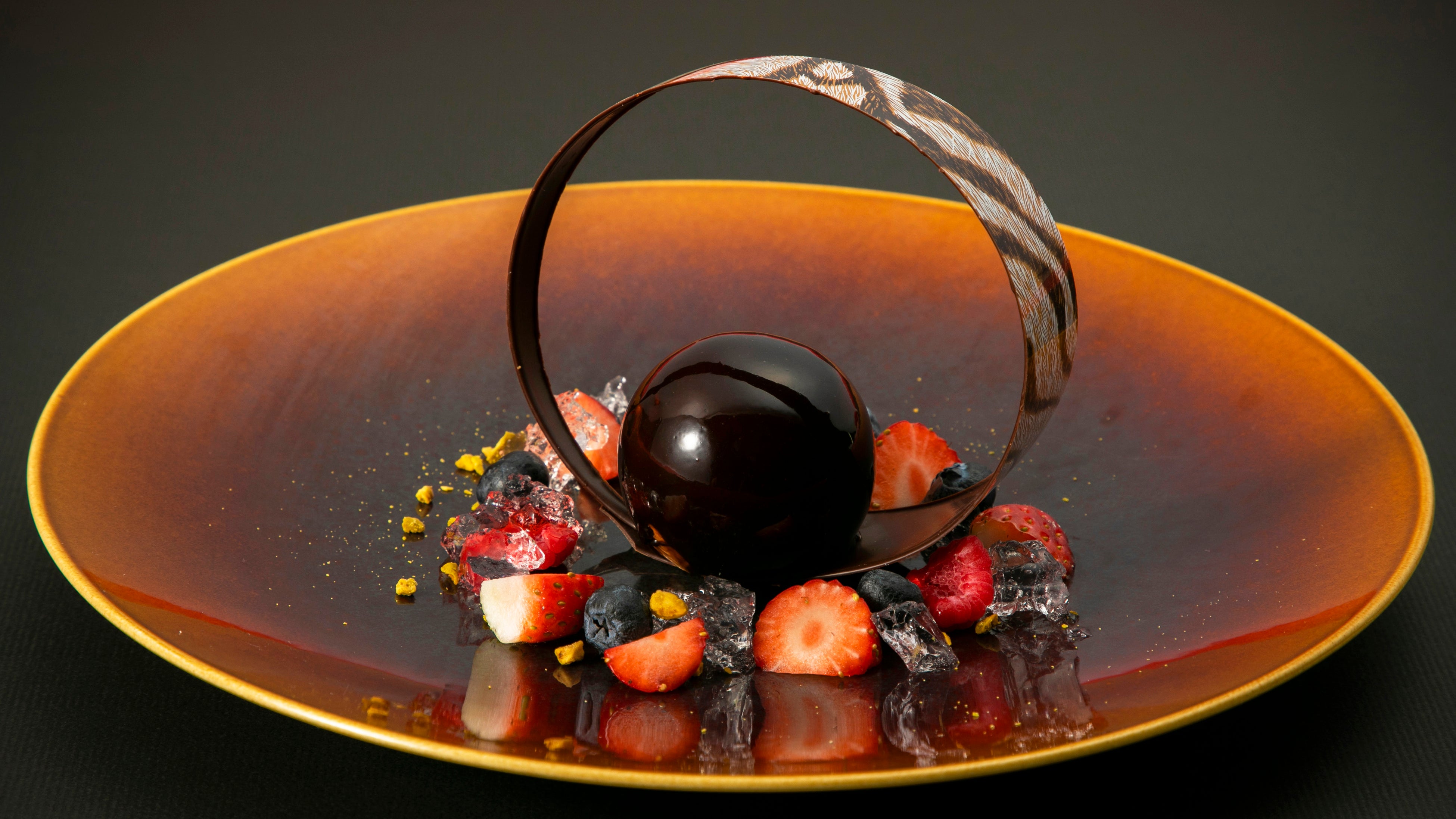 フランス料理 トリアノン(28F)のバレンタインディナーは、オマール海老のビスクスープや国産牛ロースのローストなどが味わえ、シェフパティシエ特製チョコレートデザートは、カカオトレース認証のショコラを使用し、中心には風味豊かなピスタチオクリームとASIAGAP認証の冷凍苺を使ったジュレを忍ばせ、甘味と酸味で調和のとれた仕上がりです。