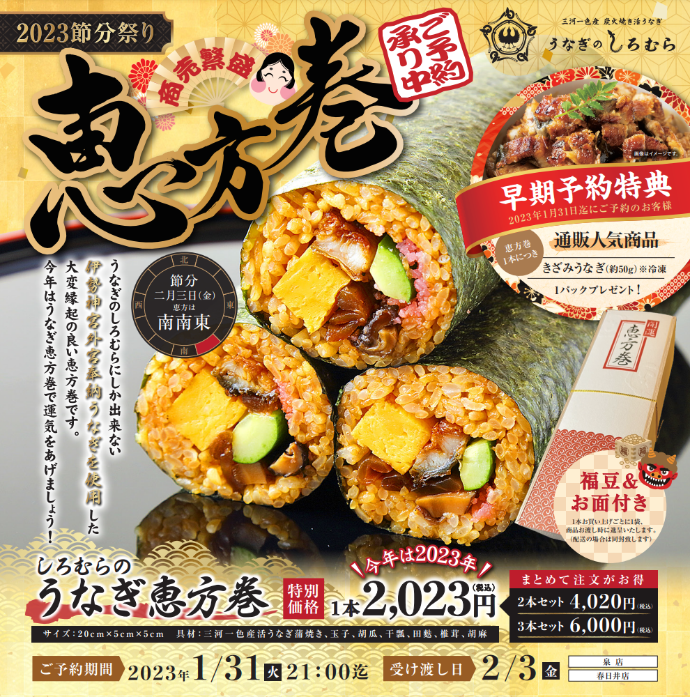 『三河一色産炭火焼活うなぎ』を提供する「うなぎのしろむら 泉店・春日井店」では、自慢のうなぎを使用したうなぎのしろむら特製の恵方巻を2023年1月31日(火)までのご予約限定にて販売を開始しました。