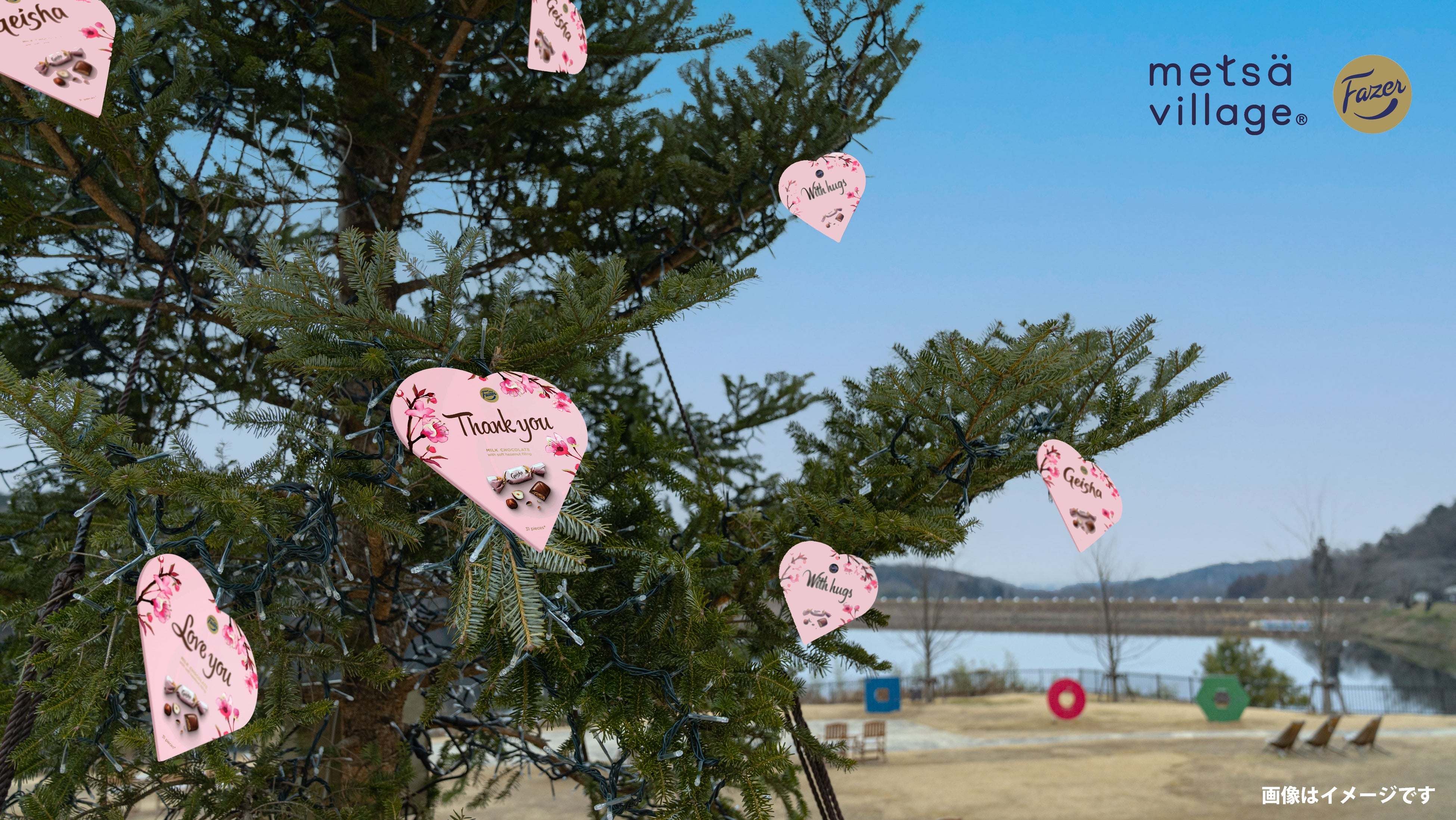 メッツァビレッジ内のもみの木にバレンタインツリーが登場します。ハート型のオーナメントは、Fazerを代表するピンク色がトレードマークのチョコレート「Geisha」*(ゲイシャ)のチョコレートボックスがモチーフ。「Love you」「Thank you」など、ボックスに書かれている様々なメッセージにもご注目ください。